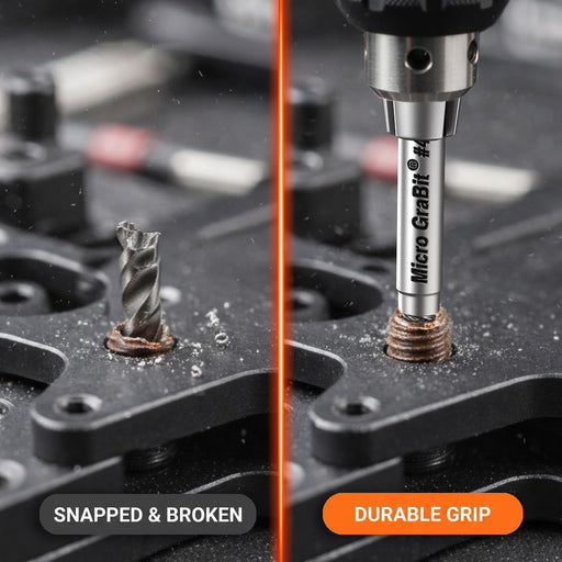 The Drill-out bits stay dead center so you don't walk all over expensive parts. The Micro Grabit bits pull out tiny screws without destroying the threads. The X-Out bits grab stripped screw heads without any drilling at all.