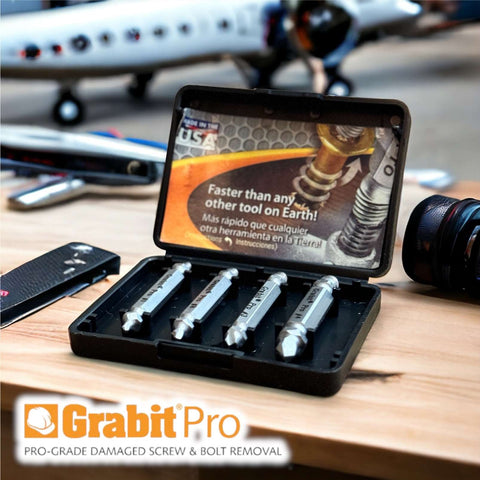 Grabit® Drill-Out is our toughest product. Grabit® Drill-Out is tempered twice to achieve its professional strength hardness resulting in multiple extractions per tool. Remove damaged bolts and extract free spinning bolts with Grabit® Drill-Out! This set extracts screws and bolts easily from wood, metal or plastic and removes screws made of any alloy, including soft screws. The applications are infinite! Automobiles, toys, furniture, appliances and more!